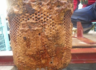 深井戸水中ポンプの取水部はスケールで覆われていたが、砂利を吸い込んだ形跡はありませんでした。